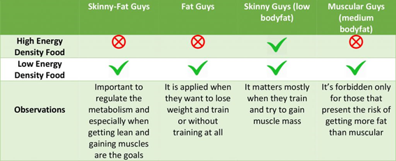 Alimentos de baixa densidade – Caras falso-magro (normalmente com membros magros, porém possuem gordura abdominal e/ou são flácidos). Importante para regular o metabolismo e especialmente quando ficar seco e ganhar músculos forem o objetivo.
